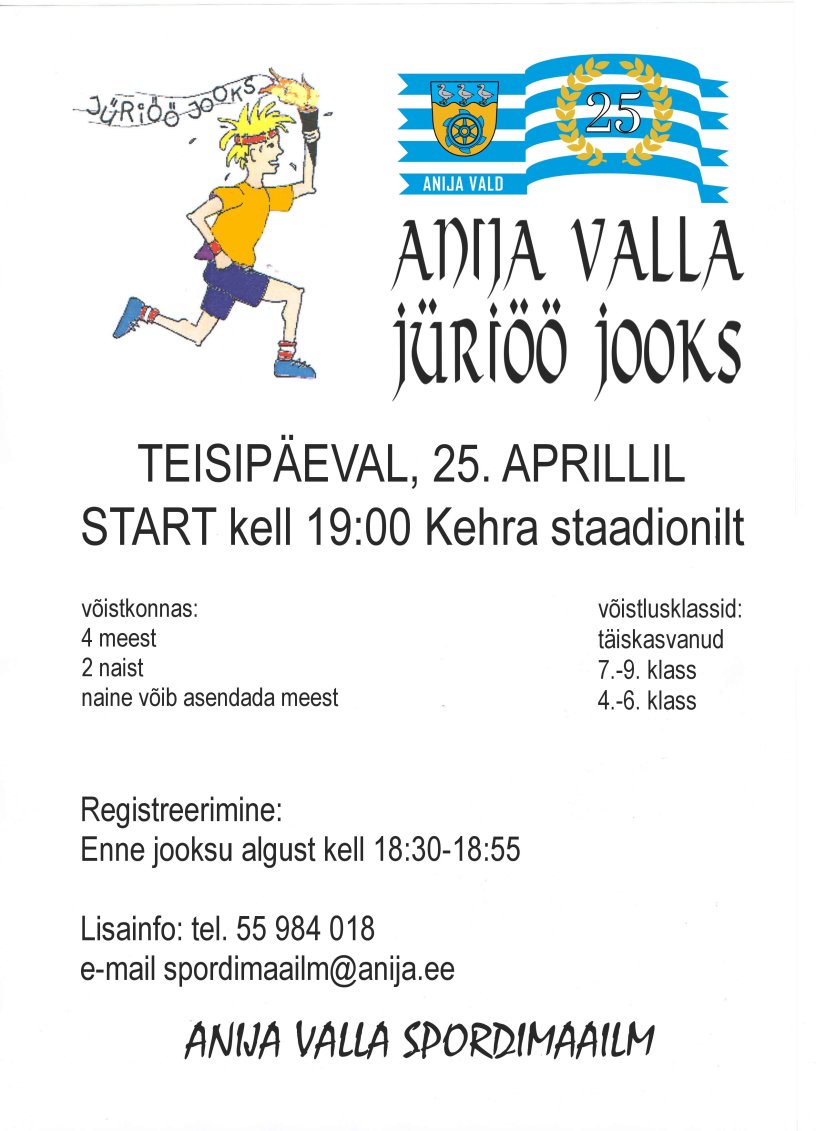 Anija Valla Spordimaailm korraldab 25. aprillil traditsioooniks saanud jüriöö teatejooksu. Stardi- ning finišipaik on Kehra staadionil ning start antakse kell 19:00. Võistkond koosneb neljast mehest ning kahest naisest. Meest võib vajadusel naisega asendada, kuid mitte vastupidi. Jooksudistants kogupikkusega 4 km on jaotatud 800- (mehed) ja 400-meetristeks (naised) lõikudeks. Eelregistreerimine toimub e-maili teel spordimaailm@anija.ee. Registreeruda saab ka enne võistluse algust kohapeal kell 18:30-18:55. Võistlusklassid: täiskasvanud, 7.-9. klass, 4.-6. klass. Parimatele auhinnad!